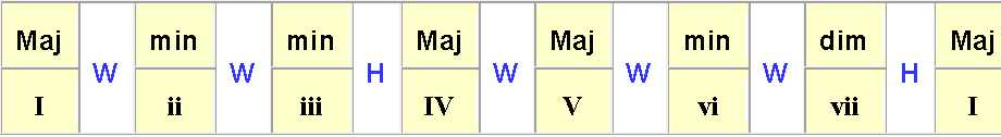 Below is a diagram showing the intervals of the major scale. Each yellow box can be seen as a