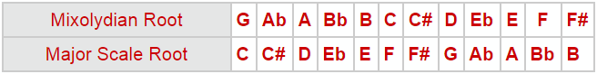 The Mixolydian mode is the fifth mode of the major scale. The interval formula is root (1), second (2), major third (3), fourth (4), fifth (5), sixth (6) and minor seventh (b7). It has the same notes as the Ionian mode, except the minor seventh (b7), it is considered a major scale. The Mixolydian mode can be used over any non-altered dominant chord as dom7, dom9, dom11, dom13, 7sus4. The Dominant scale is the another name for the Mixolydian mode. It is called " dominant" because it is built from the 5th degree of the major scale also called "dominant". The Mixolydian mode is widely used in jazz and blues music for improvising over dominant chords. It is one of the MOST important scale to know.